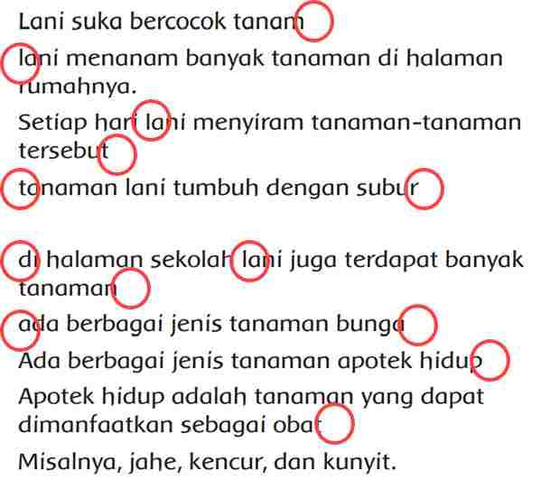 Lani suka bercocok tanam lani menanam banyak tanaman di halaman rumahnya. Setiap hari lani menyiram tanaman-tanaman tersebut tanaman lani tumbuh dengan subur di halaman sekolah lani juga terdapat banyak tanaman ada berbagai jenis tanaman bunga. Ada berbagai jenis tanaman apotek hidup Apotek hidup adalah tanaman yang dapat dimanfaatkan sebagai obat Misalnya, jahe, kencur, dan kunyit.